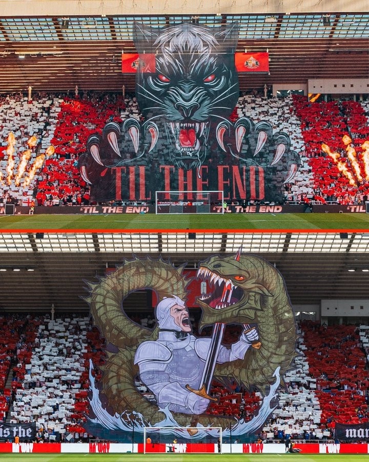 时隔多年重回英超的黑猫在首轮3-0完胜西汉姆联,俱乐部今天晒出了球迷制作的巨幅Tifo并配文:“咱们用我方的阵势作念到了。”