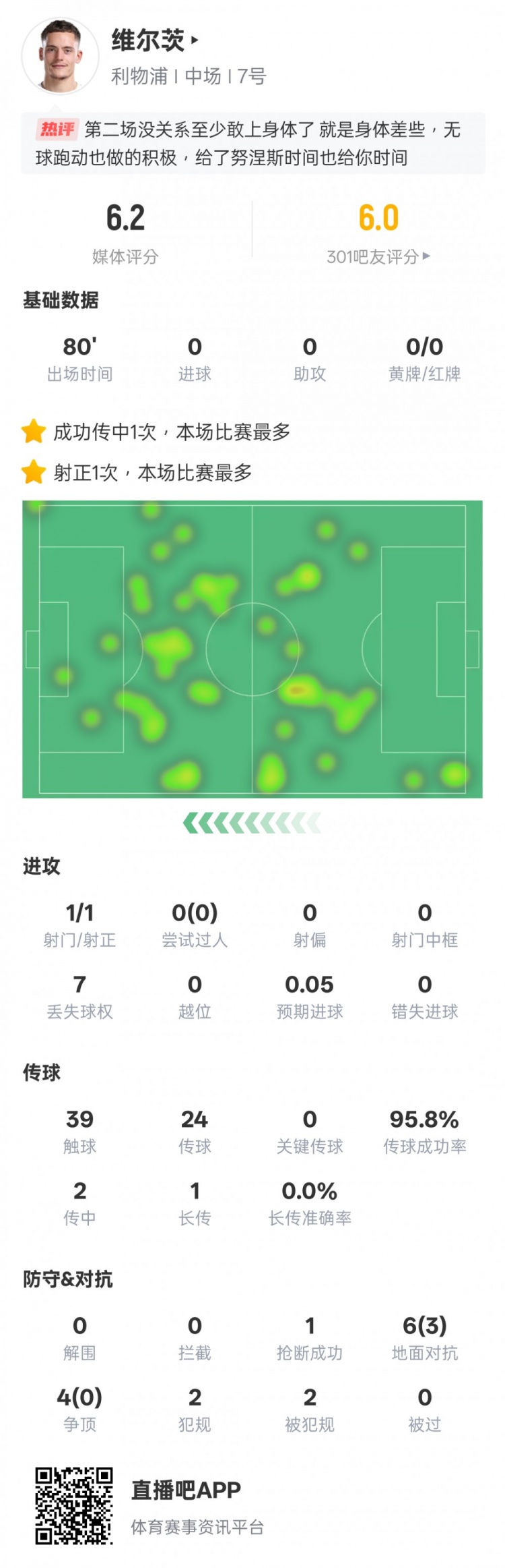 8月26日讯 2025-26赛季英超第2轮,利物浦3-2纽卡斯尔。维尔茨首发出战,1次射门1次射正,传球生效能95.8%,还有1次抢断,评分6.2。