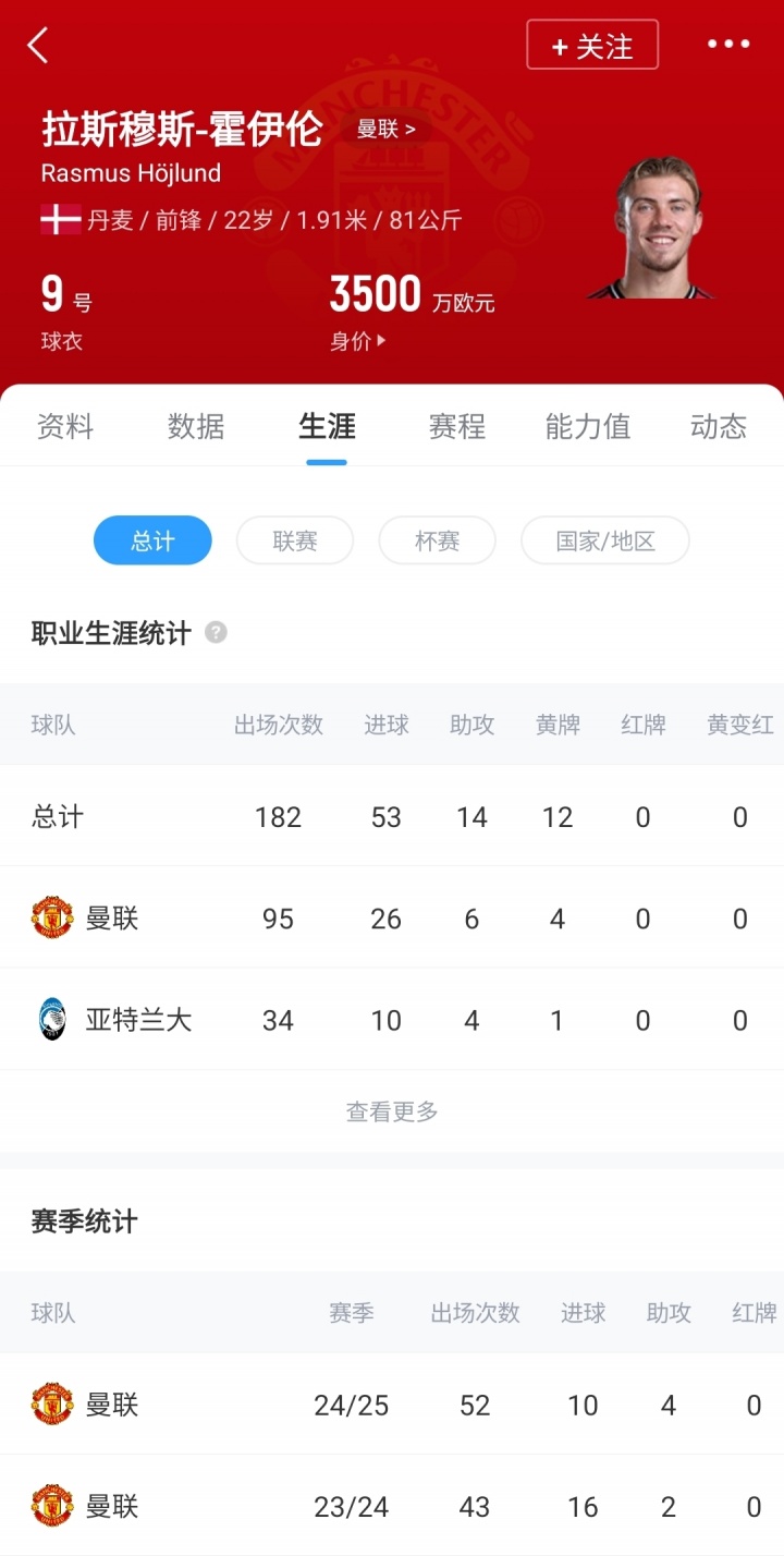 霍伊伦现年22岁,曼联2023年夏天消耗7780万欧从亚特兰大引进霍伊伦。在曼联的两个赛季,霍伊伦共代表球队出战95场比赛,孝顺26球6助攻。现在,霍伊伦的德回身价为3500万欧。