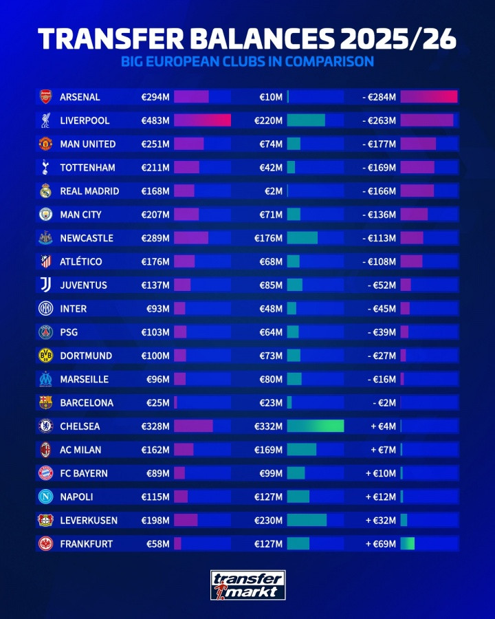 直播吧09月05日讯德转统计了大俱乐部的夏窗净进入排名,枪手2.84亿居首,赤军第2,曼联第3。