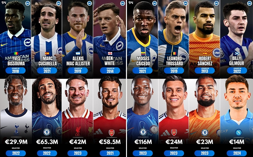 2025夏窗的硝烟散尽,布莱顿出售12名球员,赚得1.55亿欧元,成为了近五年来独一在转会市集赢利的英超球队(1000万欧元)。