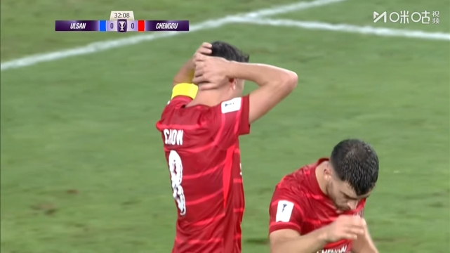 09月17日讯 亚冠精英联赛东亚区第1轮,成齐蓉城客场对阵蔚山HD,比赛第32分钟,费利佩传中,周定洋门前近距离包抄敲门偏出,随后抱头显得尽头痛恨,比分照旧0-0。