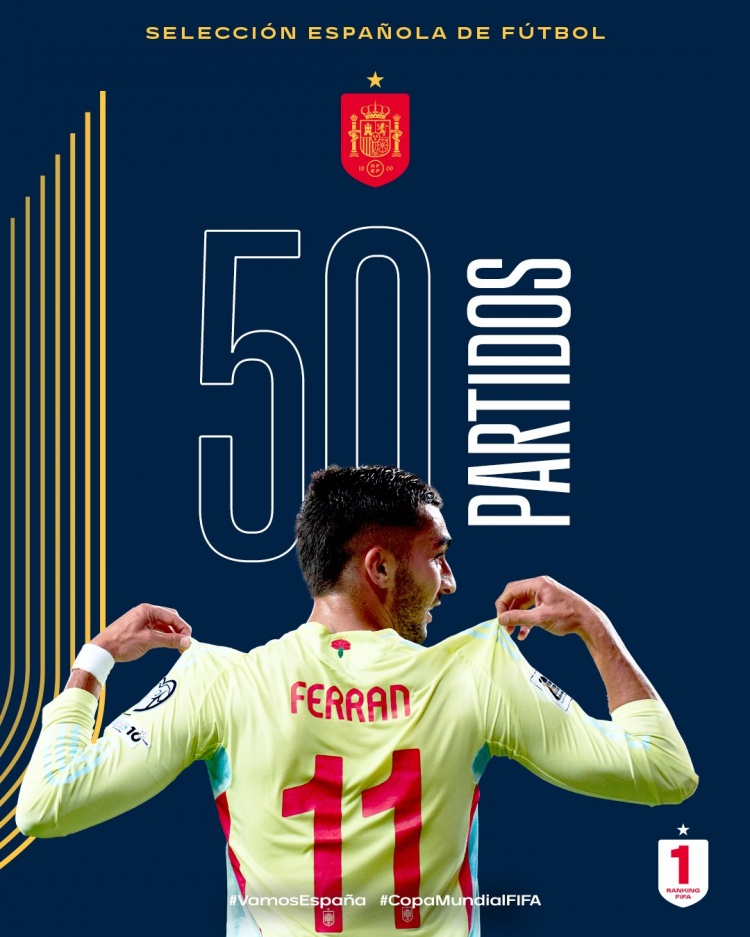 西班牙足协官方晒出了费兰-托雷斯50场比赛的海报,并配文写谈:“为国度队出战50场,祝颂费兰-托雷斯!”