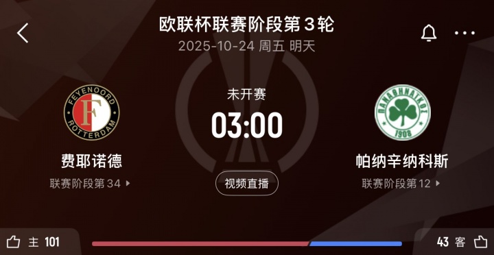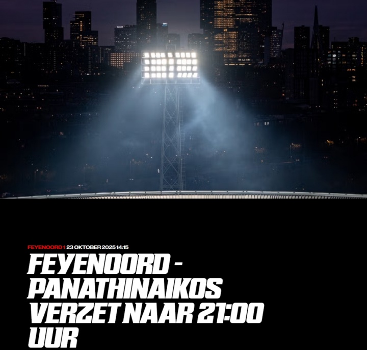 10月23日讯 官方讯息,原定北京时期今晚22点30分进行的欧联杯,费耶诺德主场vs帕纳辛纳科斯的比赛因天气原因推迟。