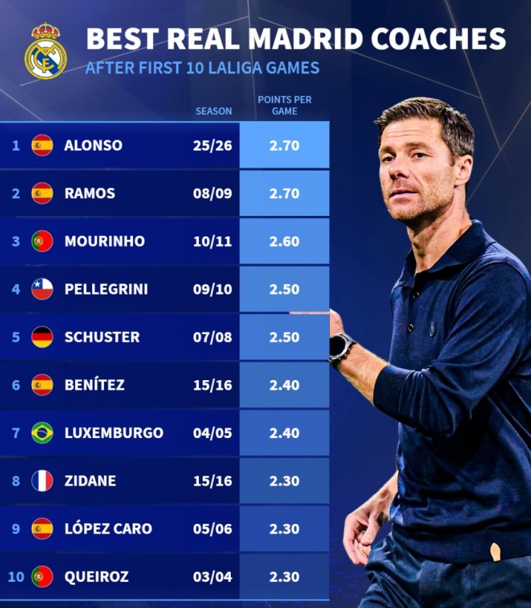 10月27日讯 皇马在本轮西甲焦点战2-1力克巴萨,阿隆索带队不绝了出色的战绩。德转数据统计潜入,阿隆索握教皇马的前10轮西甲拿分并排历史第一。