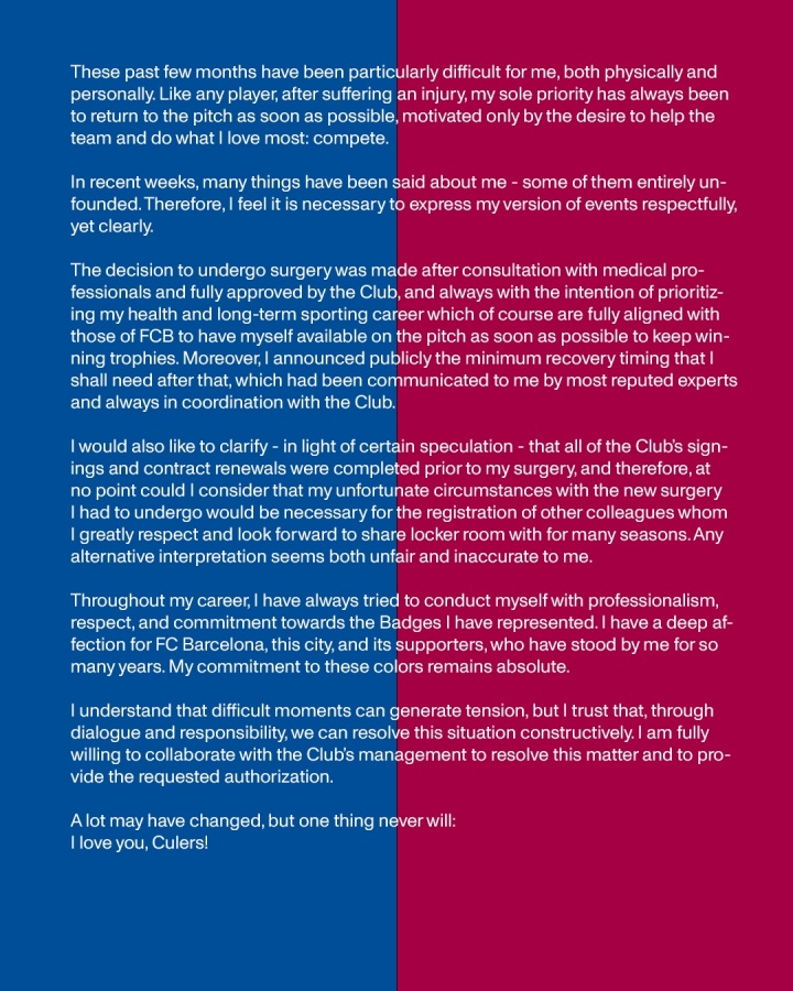 特尔施特根近日被巴萨暂时打劫队长袖标,球员发表声明,对近期的事情作念出回复。