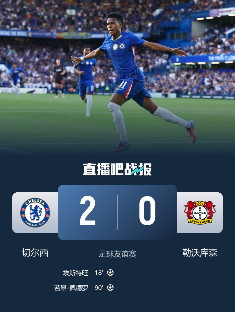 友谊赛对阵,切尔西2-0打败勒沃库森,埃斯特旺首秀破门,若昂-佩德罗也不竭了进球气象。