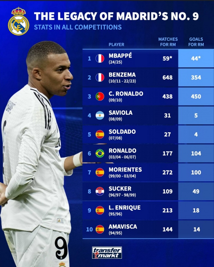 8月9日讯 皇马官方告示,恩德里克将身穿9号球衣,德国转会商场盘货了皇马近10位9号球员。