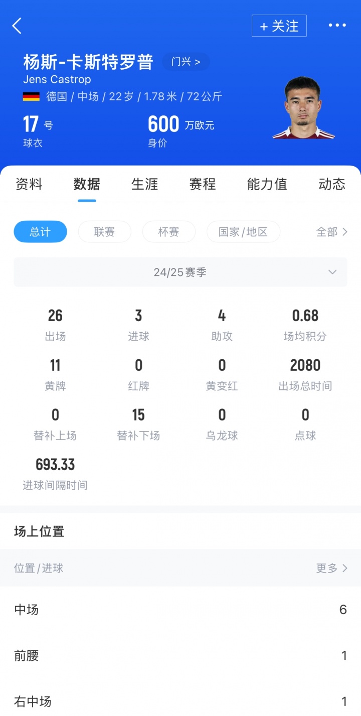 卡斯特罗普是韩国与德国混血,身高178,司职中场。球员德回身价600万欧,本年夏窗以450万欧转会费从纽伦堡加盟门兴。