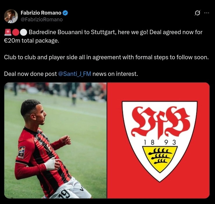 8月30日讯 据驰名转会群众罗马诺报说念,斯图加特将签下尼斯20岁先锋布阿纳尼,Here we go!