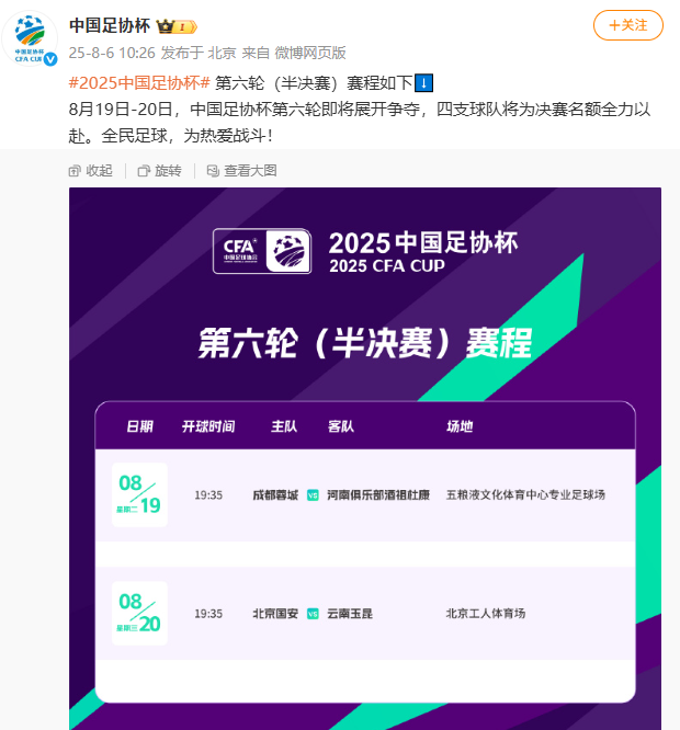 央视网讯息:北京技能8月6日,中国足协杯官方发布讯息,足协杯两场半决赛技能细则,区分于8月19日以及20日进行。