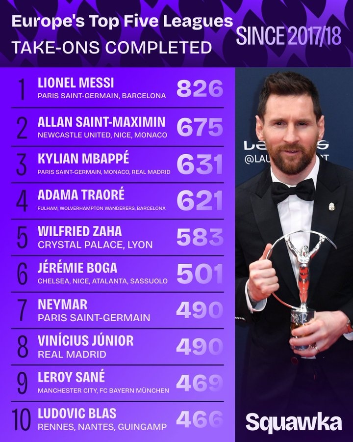 9月6日讯 Squawka统计了自2017-18赛季以来,欧洲五大联赛球员的过东说念主次数排行,梅西826次位列第一。