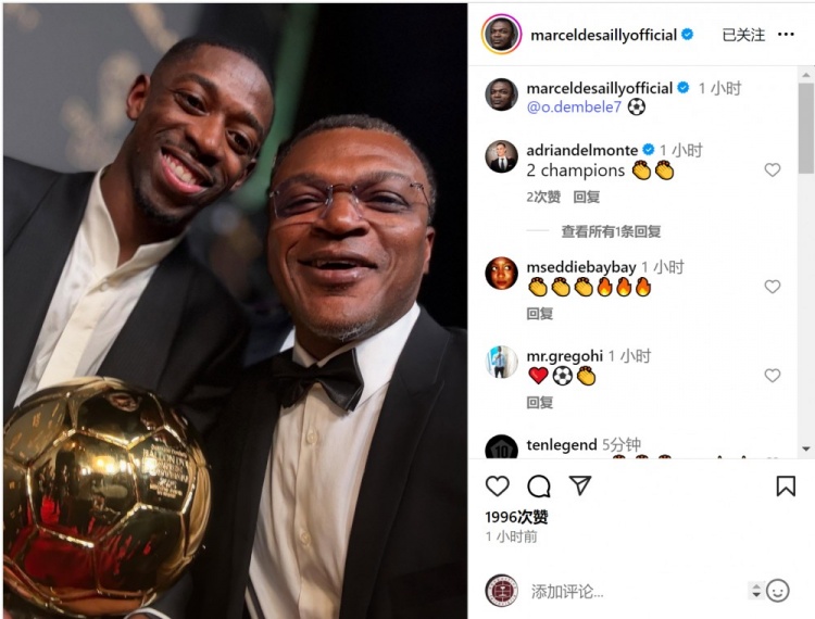 法国足坛名宿德塞利出席了受奖庆典,他在应付媒体上晒出与登贝莱的合照,对后辈示意祝愿。
