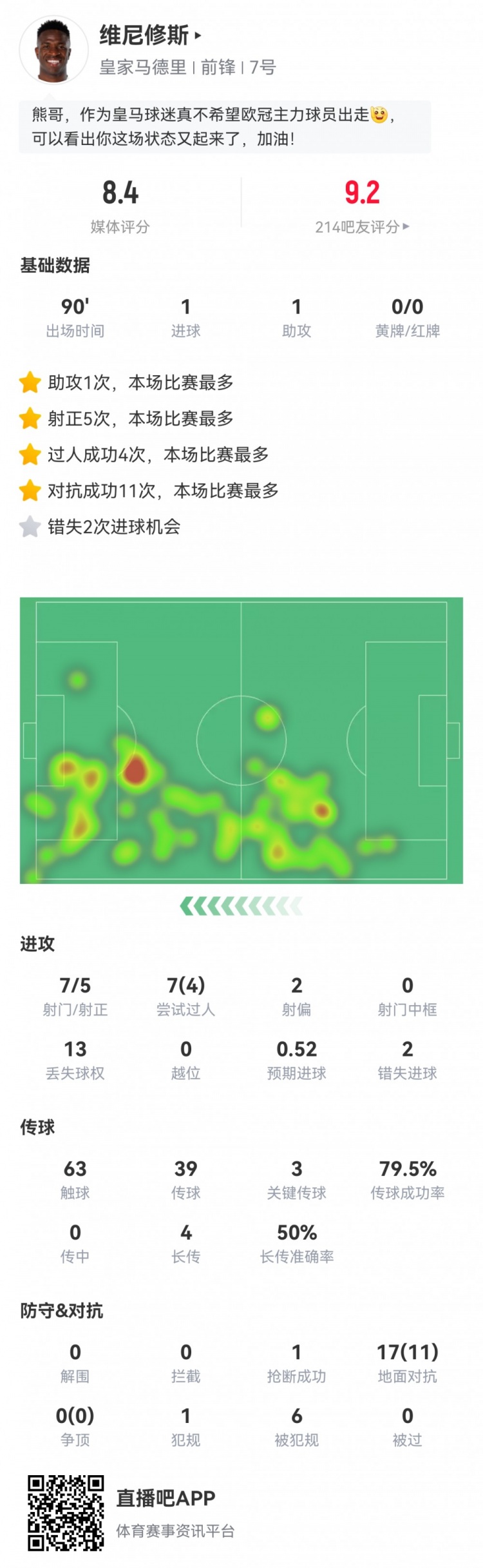 9月24日讯 本轮西甲,皇马4-1客胜莱万特。此役维尼修斯首发打满全场,球员全场要点数据如下↓