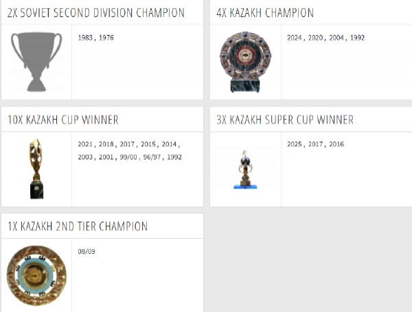 阿拉木图凯拉特一共赢下过4次哈萨克斯坦超等联赛冠军,最近的一次是在2024年。他们不单是拿到了联赛冠军,还包揽了国内杯赛,成就双冠王。这亦然1992年之后,球队再一次取得这么的成就。