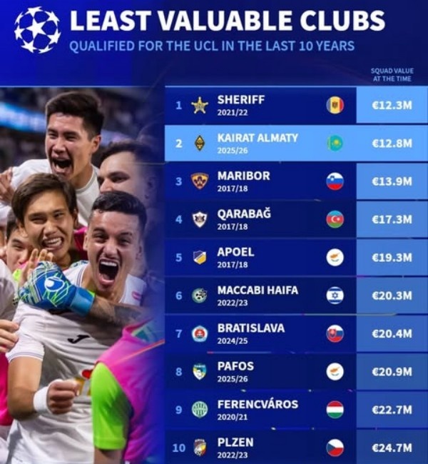 若是用德回身价来对比,甚而还能更直不雅。中超球队申花的德回身价是1383万欧元,打入欧冠正赛的阿拉木图凯拉特的德回身价是1273万欧元。