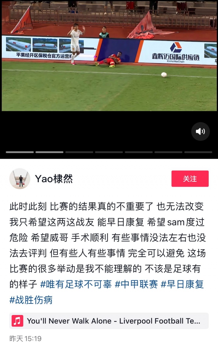“今天中秋,两位战士齐躺在病院的病床上,被犯规后换来的是摊手,被伤害的赛后换来的也仅仅轻盈的一声慰问,恶果也蜕变不了,对身段形成的严重伤害不可逆转。哎,不好再说什么,早日康复,两位战友”