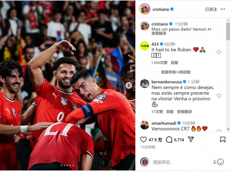 C罗社媒晒出与队友们沿路庆祝的像片,并配文:“又迈出一步!加油!”