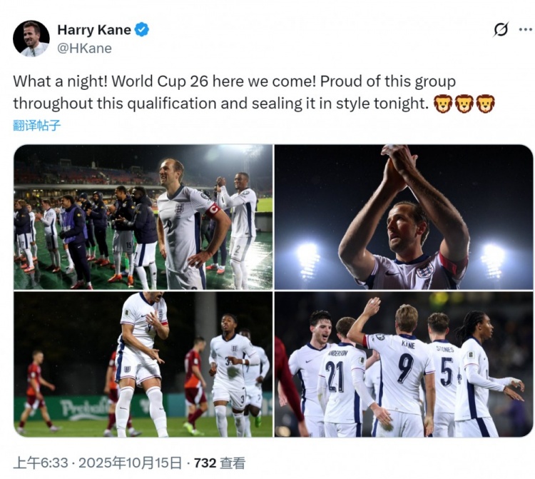 凯恩社媒晒出谢场的相片,并配文:“何等玄妙的通宵!2026年天下杯咱们来了!为球队辞世初赛中的表示感到夸口,今晚更所以精彩的收效锁定席位!”
