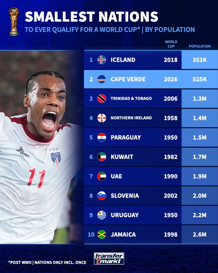 10月15日讯 德国转会阛阓列出了参预宇宙杯东谈主口最少的国度,冰岛居首,佛得角次席。