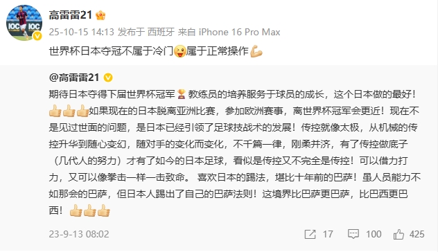 高雷雷转发了我方两年前谈日本足球的言论,并写说念:“天下杯日本夺冠不属于冷门,属于泛泛操作💪”