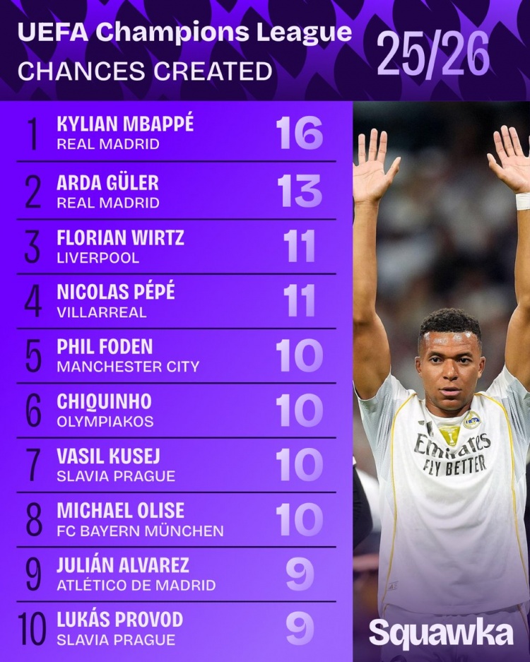 10月23日讯 Squawka统计了本赛季欧冠现在铁心的创造契机排名榜,姆巴佩位列第一,队友居莱尔第二,维尔茨第三。