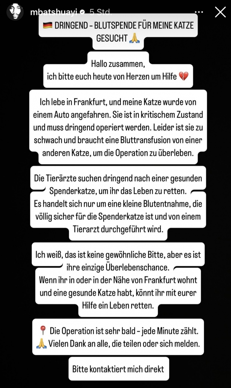 10月24日讯 法兰克福前卫巴舒亚伊更新社媒动态,为爱猫寻求献血。