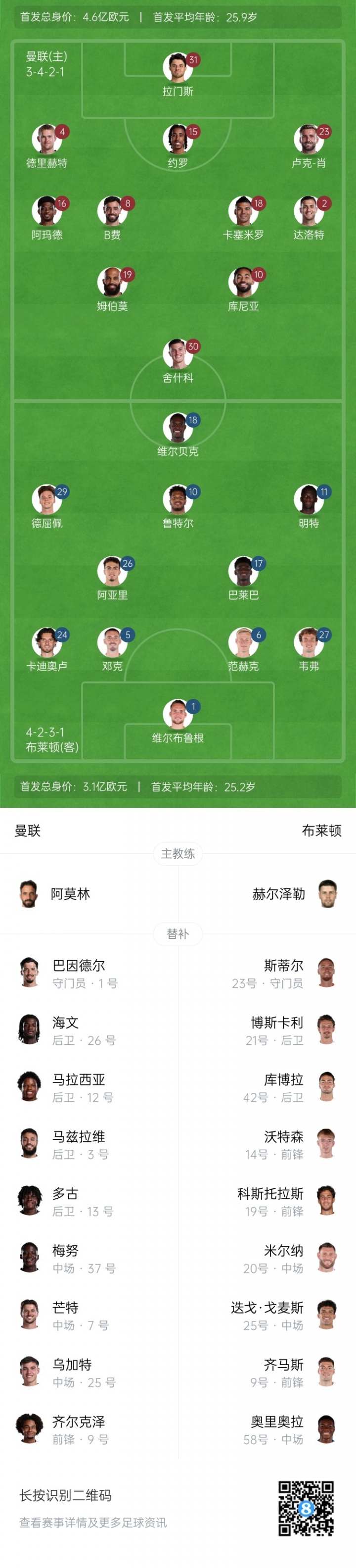 曼联首发:31-拉门斯、23-卢克·肖、4-德里赫特、15-约罗、2-达洛特、18-卡塞米罗、8-B费、16-阿玛德、10-库尼亚、19-姆伯莫、30-舍什科