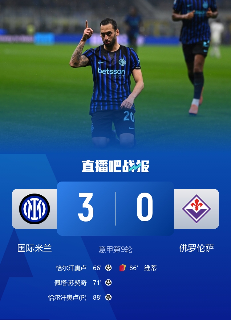 意甲-国米3-0佛罗伦萨 恰尔汗奥卢点射+双响苏契奇个东说念主秀立功