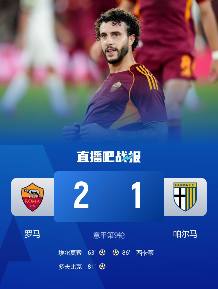 罗马本轮2-1打败帕尔马,埃尔莫索、多夫比克破门,罗马最近6轮拿下5胜!