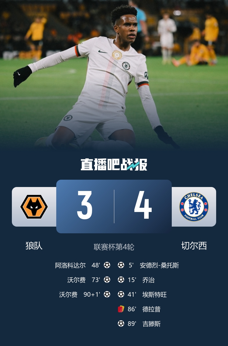 联赛杯第四轮,切尔西4-3险胜狼队,德拉普染红,桑托斯、乔治、埃斯特旺和吉滕斯破门。