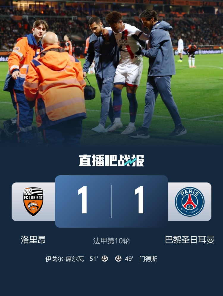 近4轮3平+仅1场零封!巴黎1-1洛里昂先赛领跑 门德斯破门杜埃伤退