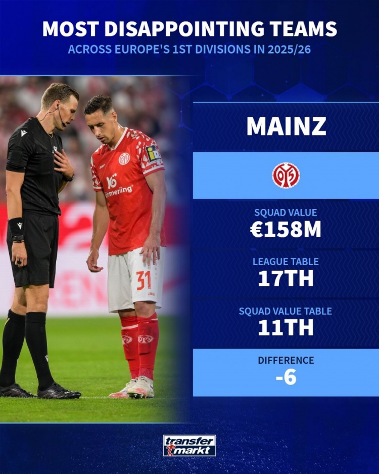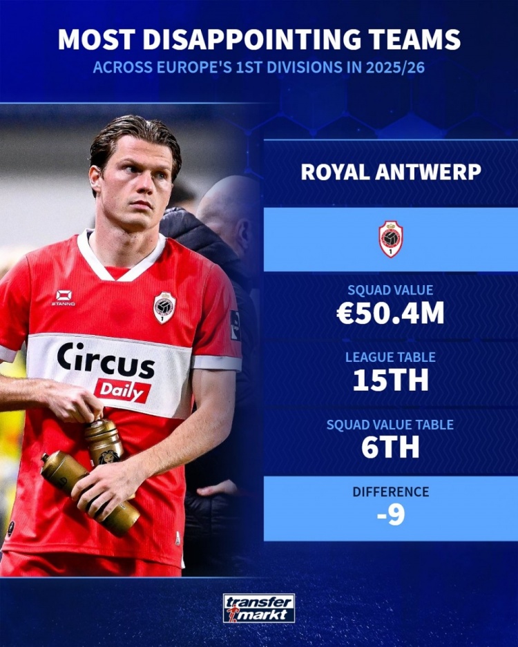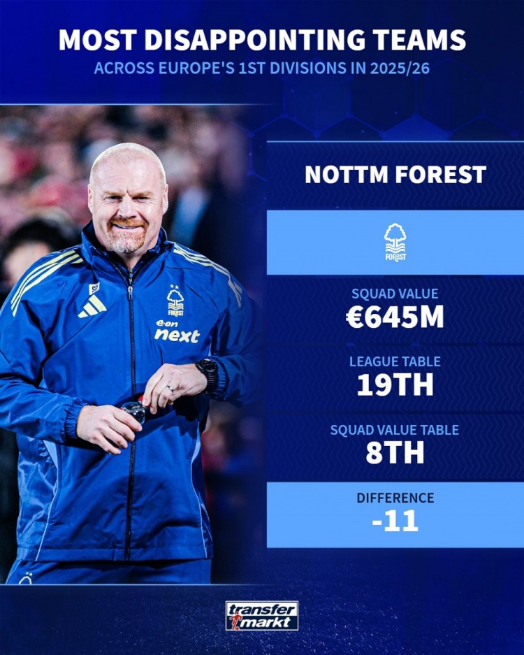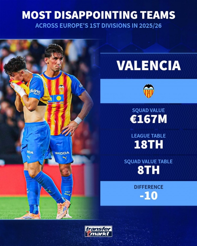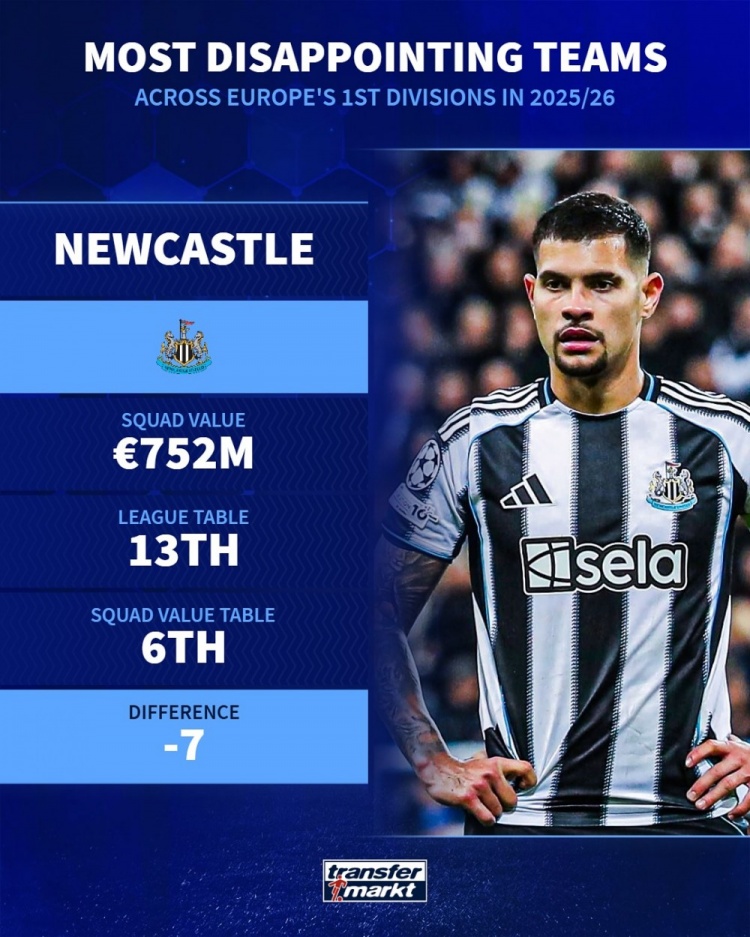 11月7日讯 德国转会商场左证球队的身价和当今的排行,列出了本赛季欧洲顶级联赛最令东谈主失望球队,佛罗伦萨、纽卡、毕尔巴鄂竞技在列。