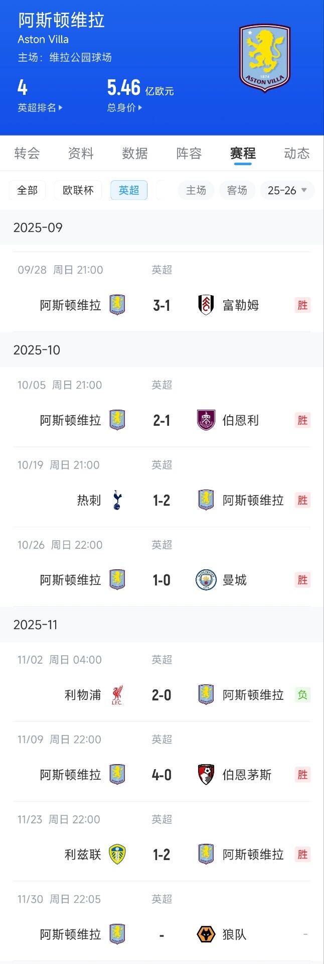 维拉这段技艺的生猛,一改此前英超开赛5轮不堪的逆境,其时他们3平2负仅3分排行英超第18位。这一波7轮6胜维拉仅输给利物浦1场,其余6场全胜的同期含金量也很高,他们打败曼城、热刺、伯恩茅斯等队。本轮事后,维拉高居英超第4名。