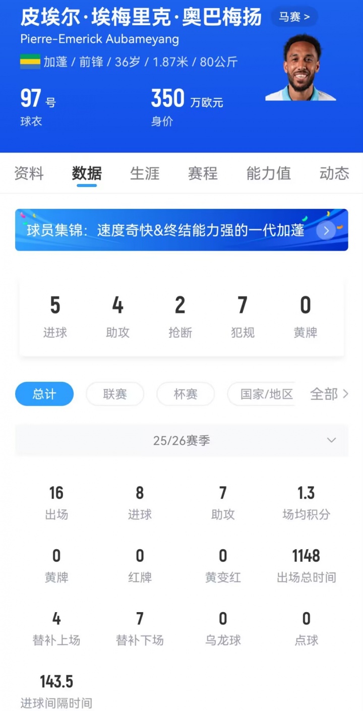 夏窗奥巴梅杨以目田身追念此前遵循过的马赛,新赛季为俱乐部在法甲+欧冠共出场16次,打进8球助攻7次,径直参与15粒进球。独造两球带队逆转劲敌后,奥巴梅杨的神锋故事仍在陆续。