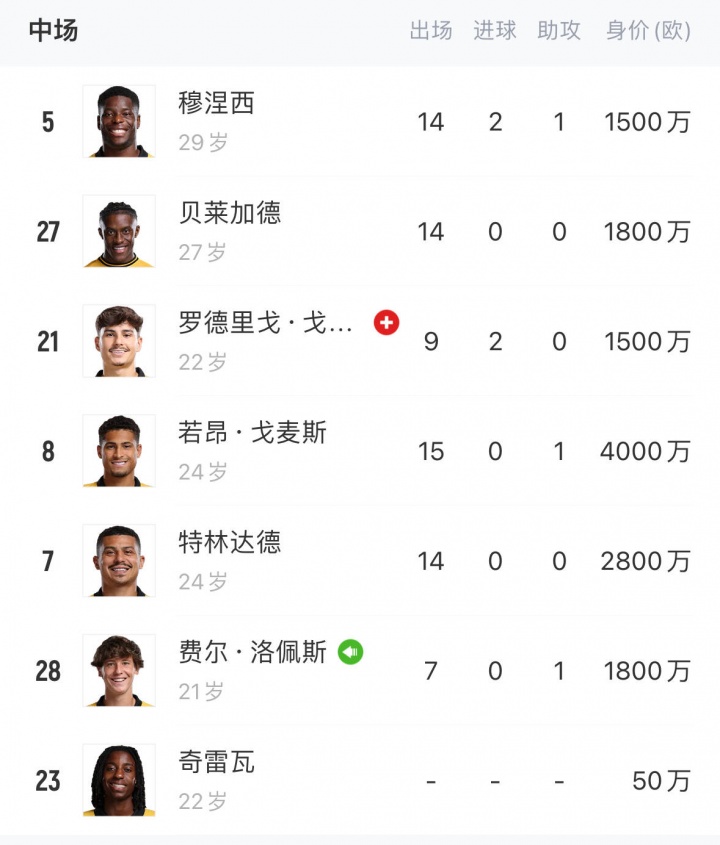 狼队中场7东谈主中,6东谈主身价均超1000万欧,仅来自津巴布韦的奇雷瓦身价50万欧,但他本赛季还未代表一线队出场过,主要在U21联赛踢球。狼队中场球员中身价最高的为来自巴西的戈麦斯,身价4000万欧,本赛季15场0球1助。