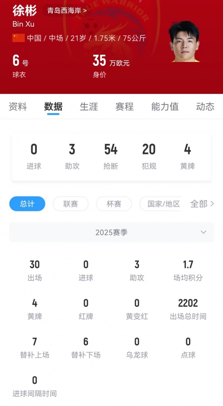 徐彬现年21岁,司职后腰,树立于广州恒大足校,他是恒大足校出品的首位男足国脚,2022年在广州队完成中超首秀,本年1月徐彬摆脱身加盟青岛西海岸。2025赛季代表青岛西海岸出战30场比赛,其中在中超出战27场,孝顺3次助攻。徐彬在本年曾入选过国足集训名单,但还未插足过比赛大名单。