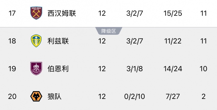 在现在的英超积分榜上,狼队12战2平10负仅积2分,名次垫底。
